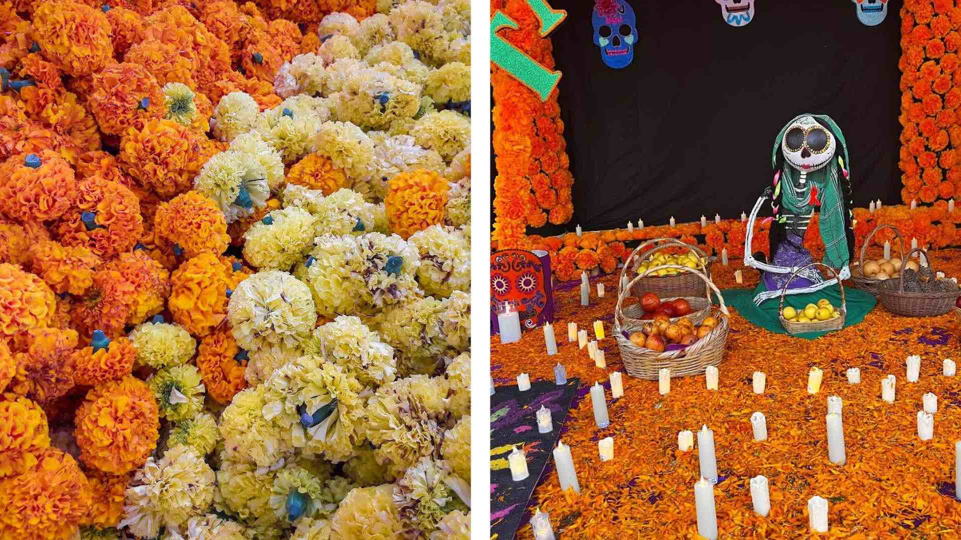 Dès mon arrivée, l’ambiance m’a transportée. Des guirlandes colorées de papel picado flottaient au vent et des bougies illuminaient les autels. Les sourires des habitants et la chaleur de l’accueil m’ont tout de suite mise à l’aise, comme si j’étais invitée à une grande réunion de famille des traditions et coutumes du día de muertos au Mexique.